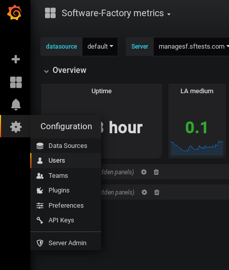 Software Factory comes with default dashboards for system, Zuul and Nodepool providers. These dashboards are automatically generated and can’t be modified by admin or users. You can use the metrics directory within the config repository to add user’s defined dashboards. These dashboards are generated from yaml files using grafyaml. You can find some documentation to add custom dashboards on the user documentation.