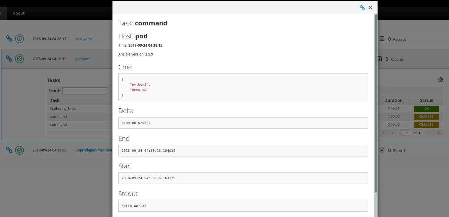 Kubectl task execution output is not reported in the console-output because the zuul_stream callback requires a direct TCP connection to the test instance. However, the task output is available in the A.R.A. report.